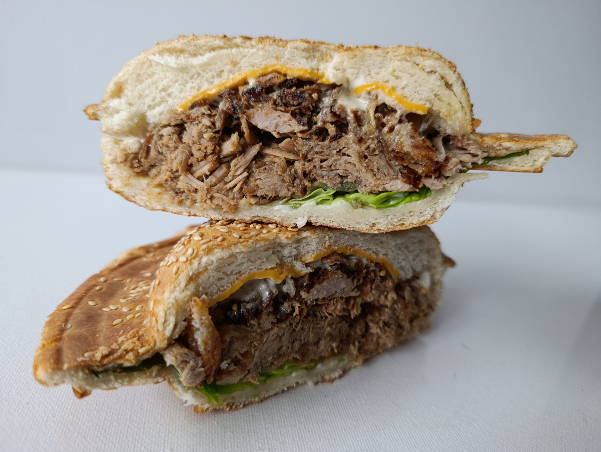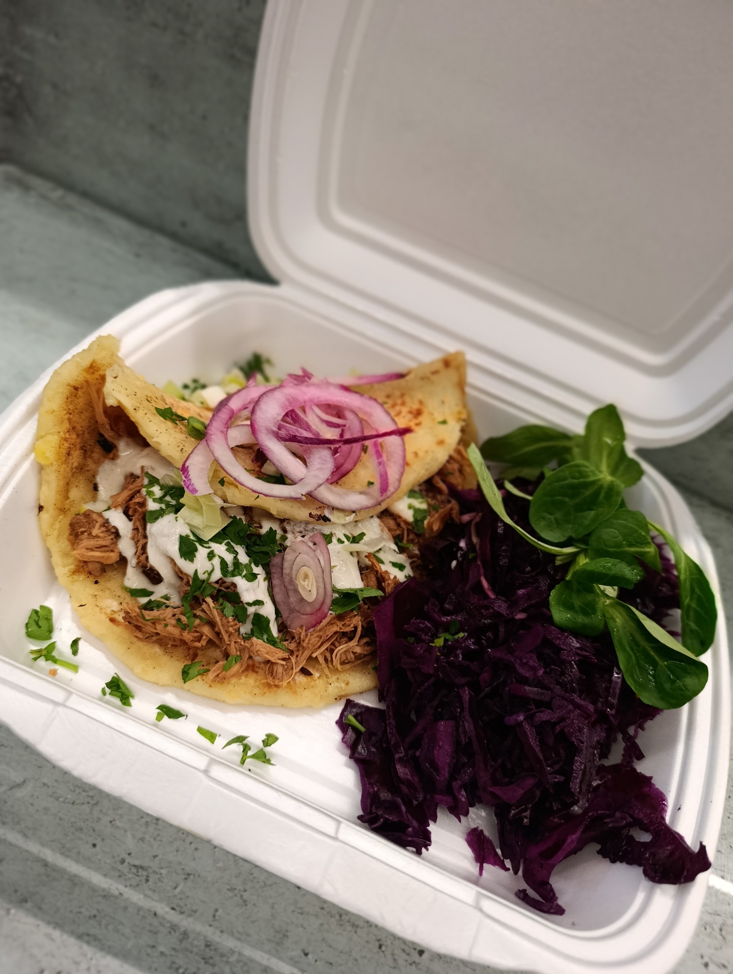A. 1ks BRAMBOROVÉ LOKŠE PLNĚNÉ TRHANÝM VEPŘOVÝM MASEM, SALAT Z ČERVENÉHO ZELÍ, KŘENOVÝ DIP 145,-