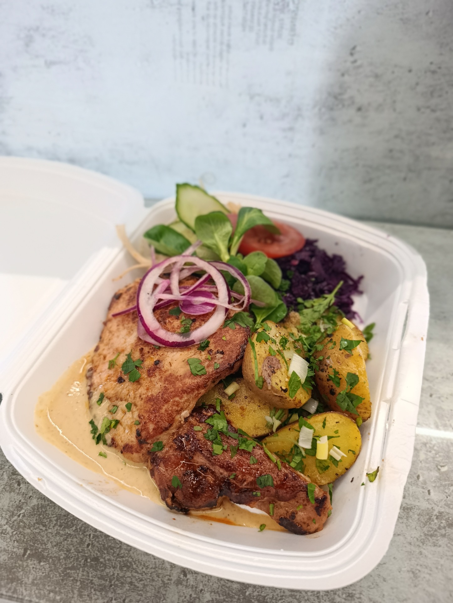 C. STEAK Z VEPŘOVÉ KOTLETY NA PAŘÍŽSKÝM PEPŘI, MEDOVO HOŘČIČNÁ OMÁČKA, OPEČENÝ BRAMBOR s bylinkami, SALÁT 165,-